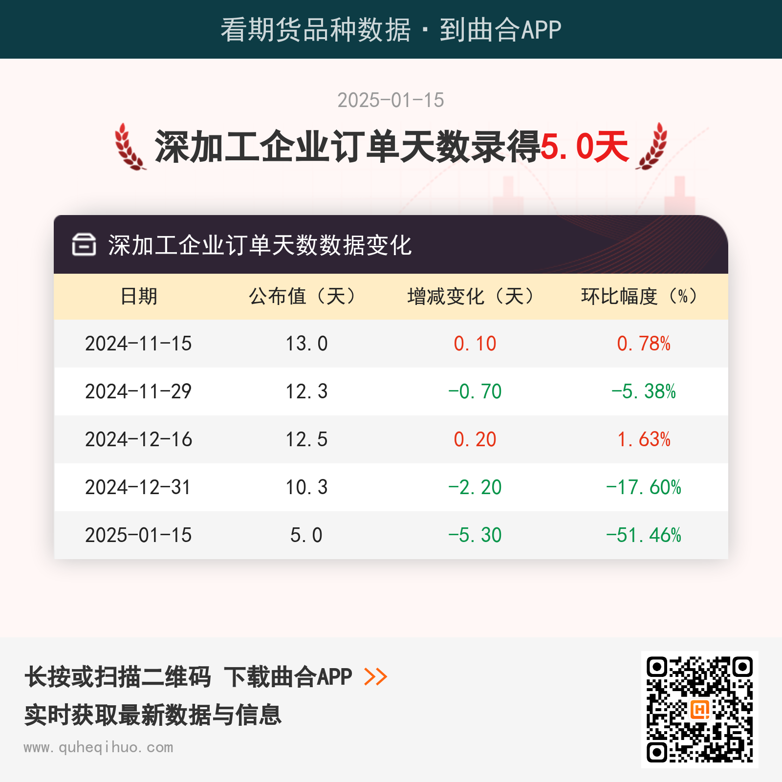 1月15日玻璃深加工企业订单天数为5.0天 2025年01月15日 | 查看: 59000 截止1月15日,玻璃深加工企业订单天数为 5.0天,较上一月减少5.3天,环比跌幅51.46%。 近期深加工企业订单天数数据变化如下: 图片来源于网络,如有侵权,请联系删除 玻璃期货实时行情 更新时间:---- 最新价 -- 涨跌值 -- 涨跌幅 -- 点击查看玻璃最新行情走势推荐阅读:人保车险|为什么车险选择至关重要?为你解析其中的奥秘!人保服务|带你了解财产一切险2024年7月5日烷基酚聚氧乙烯醚(壬基酚聚氧乙烯醚)价格行情今日报价查询2024年7月5日最新丁二酸二钠价格行情走势查询7月5日尿素期货持仓龙虎榜分析:空方离场情绪强于多方7月5日聚酯产能利用率为88.66%沥青期货主力连续3周K线收阳 短期偏强整理运行2024年7月6日今日1.4-丁烷黄内酯价格最新行情走势2024年7月6日最新过硫酸铵价格行情走势查询2024年7月6日彗星式滤料价格行情最新价格查询 其它推荐 暂无相关文章 关键词: 上一篇:1月15日PVC期货持仓龙虎榜分析:PVC主力处于净空头状态 下一篇:【库存】1月15日SBS企业库存1.92万吨