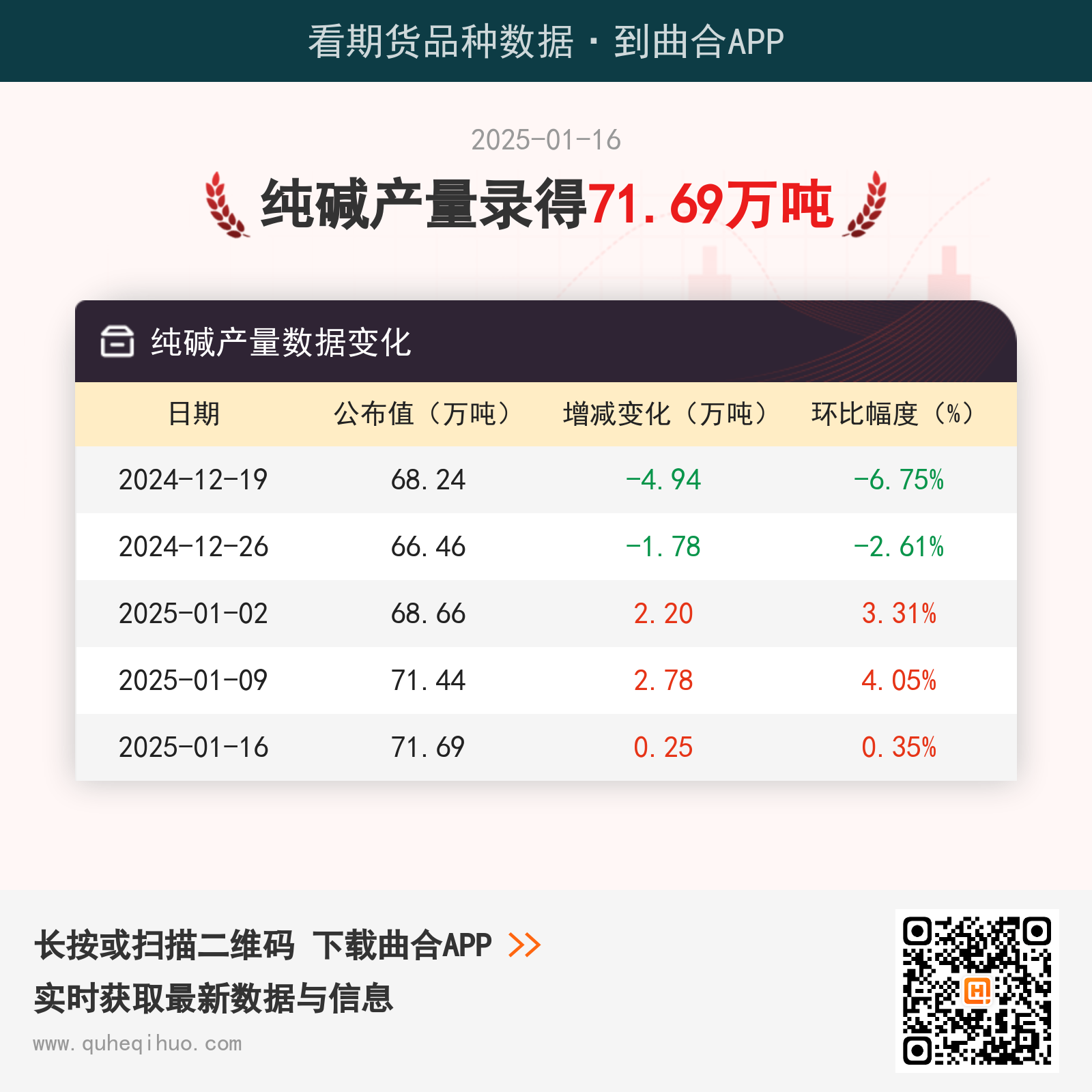 截止1月16日,纯碱产量数据录得 71.69万吨,较上一周增加0.25万吨,环比涨幅0.35%。
