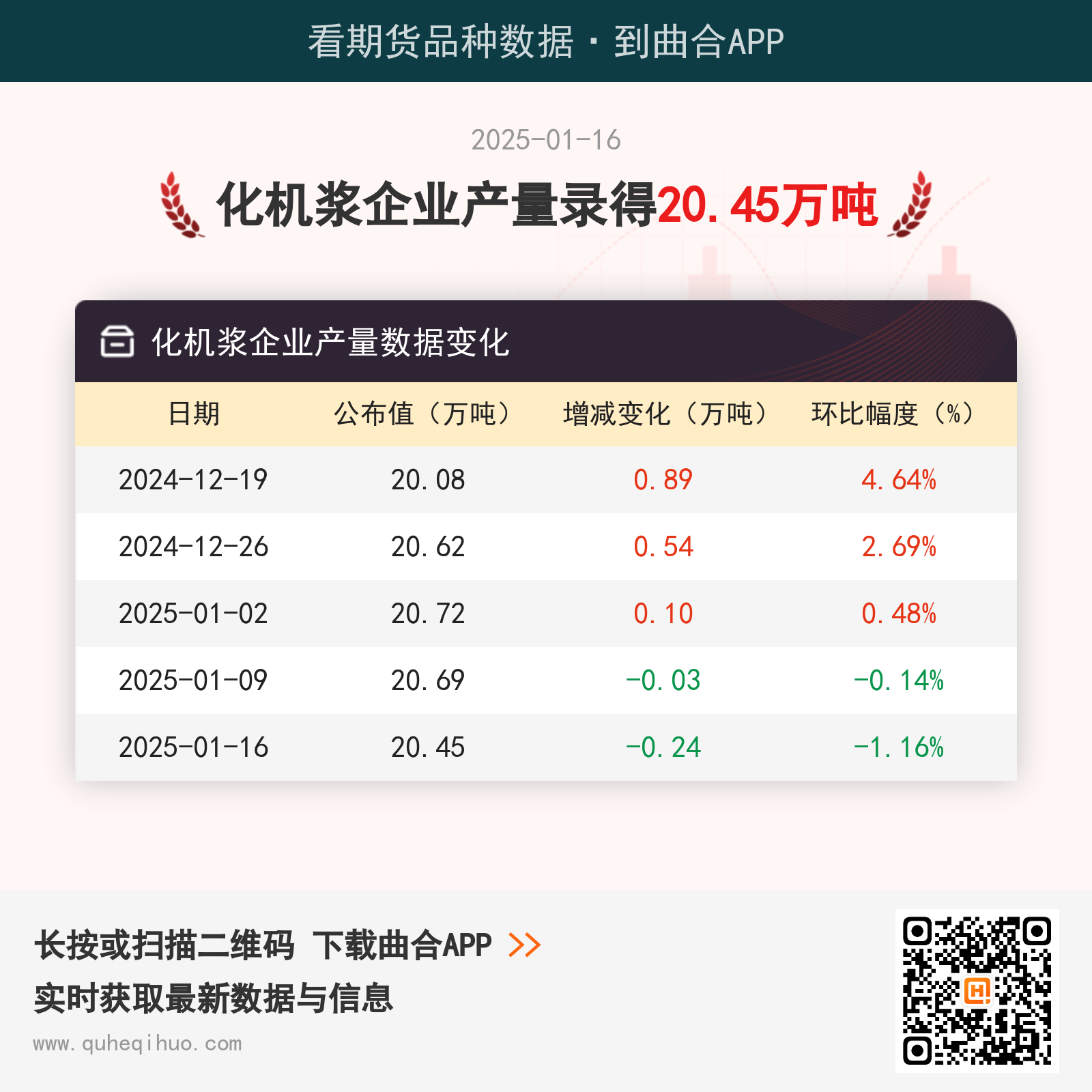 截止1月16日,化机浆企业产量为 20.45万吨,较上一周减少0.24万吨,环比跌幅1.16%。