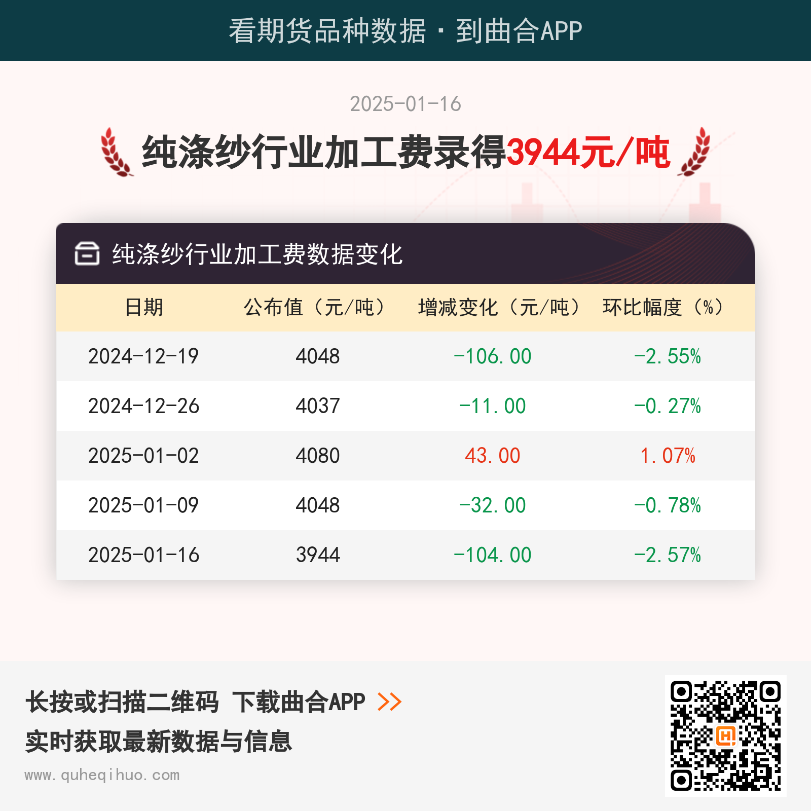 截止1月16日,纯涤纱行业加工费数据为 3944元/吨,较上一周减少104元/吨,环比跌幅2.57%。