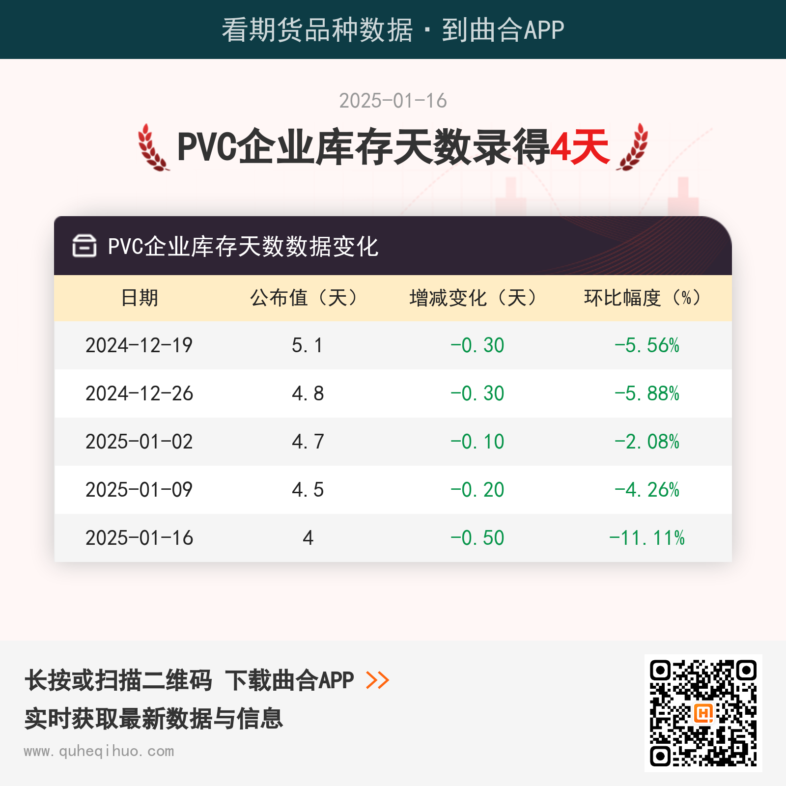 截止1月16日,PVC企业库存天数为 4天,较上一周减少0.5天,环比跌幅11.11%。