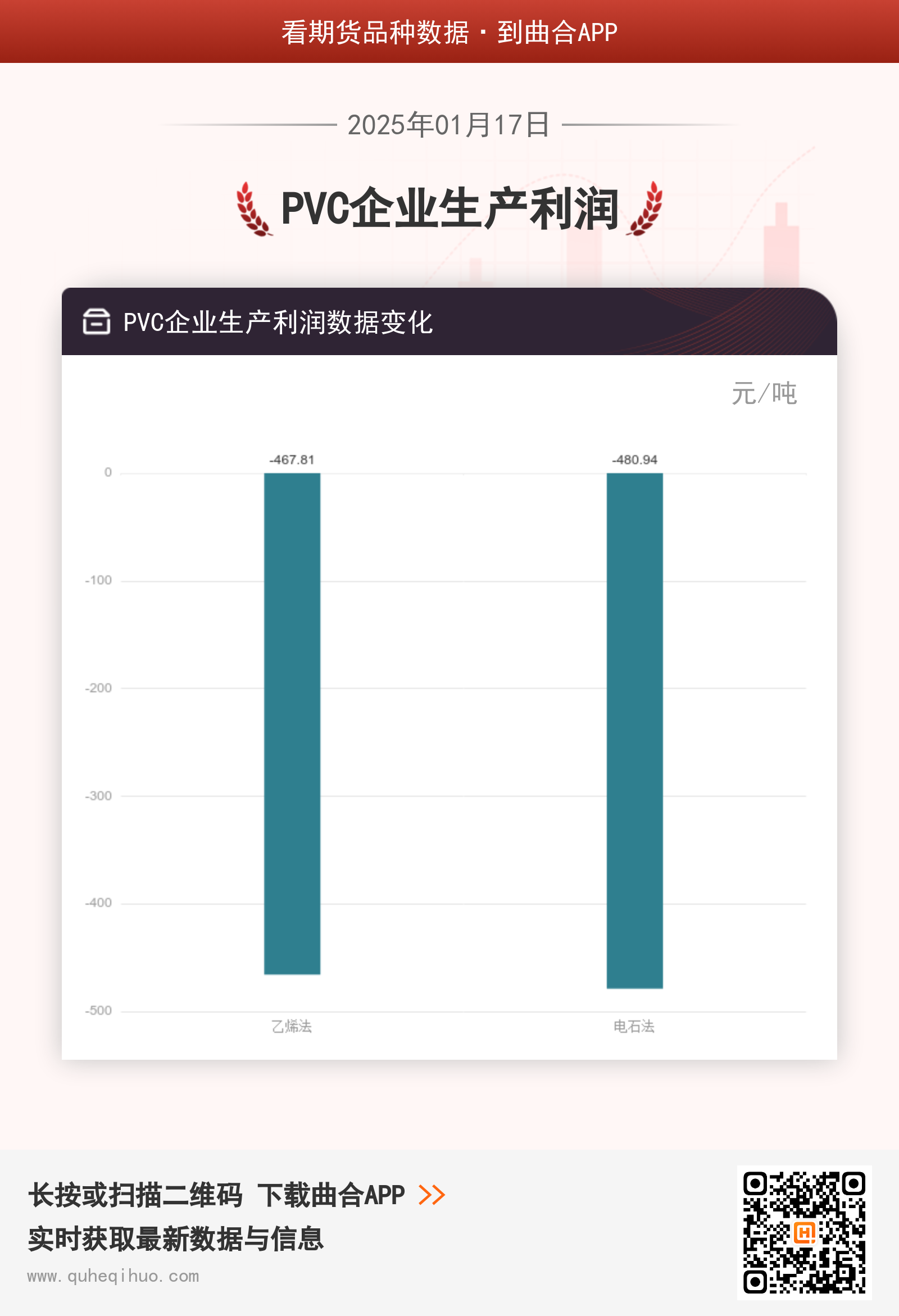 截止1月17日,乙烯法生产企业平均毛利-467.81元/吨,较上一周增加97.57元/吨,环比涨幅17.26%。电石法生产企业平均毛利-480.94元/吨,较上一周增加81.41元/吨,环比涨幅14.48%。
