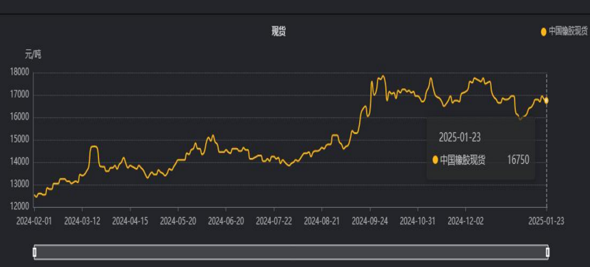1 月 23 日,中国天然橡胶现货价格为 16750 元/吨,较上周五(16600元/吨)有所上涨。