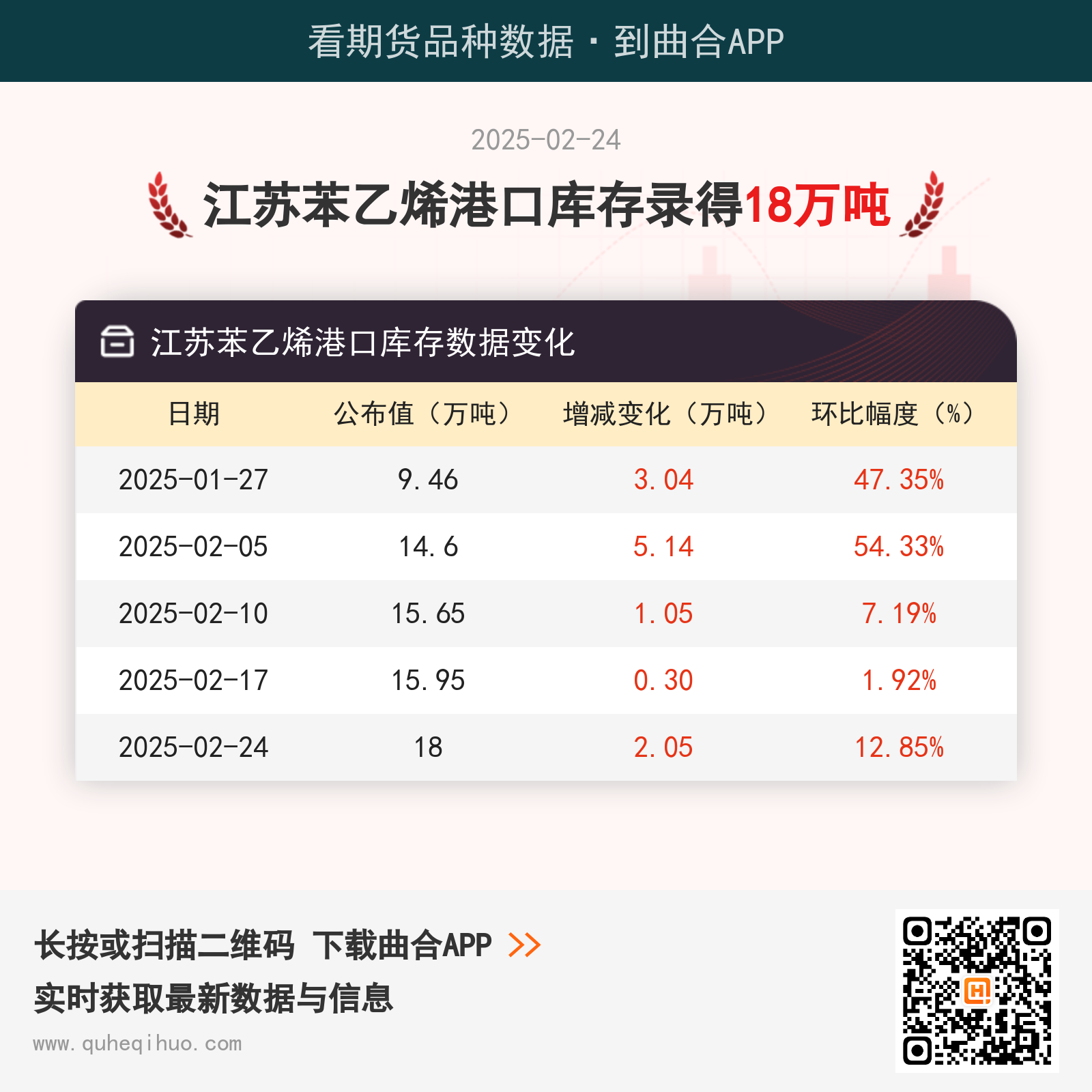 截止2月24日,江苏苯乙烯港口库存数据录得 18万吨,较上一周增加2.05万吨,环比涨幅12.85%。