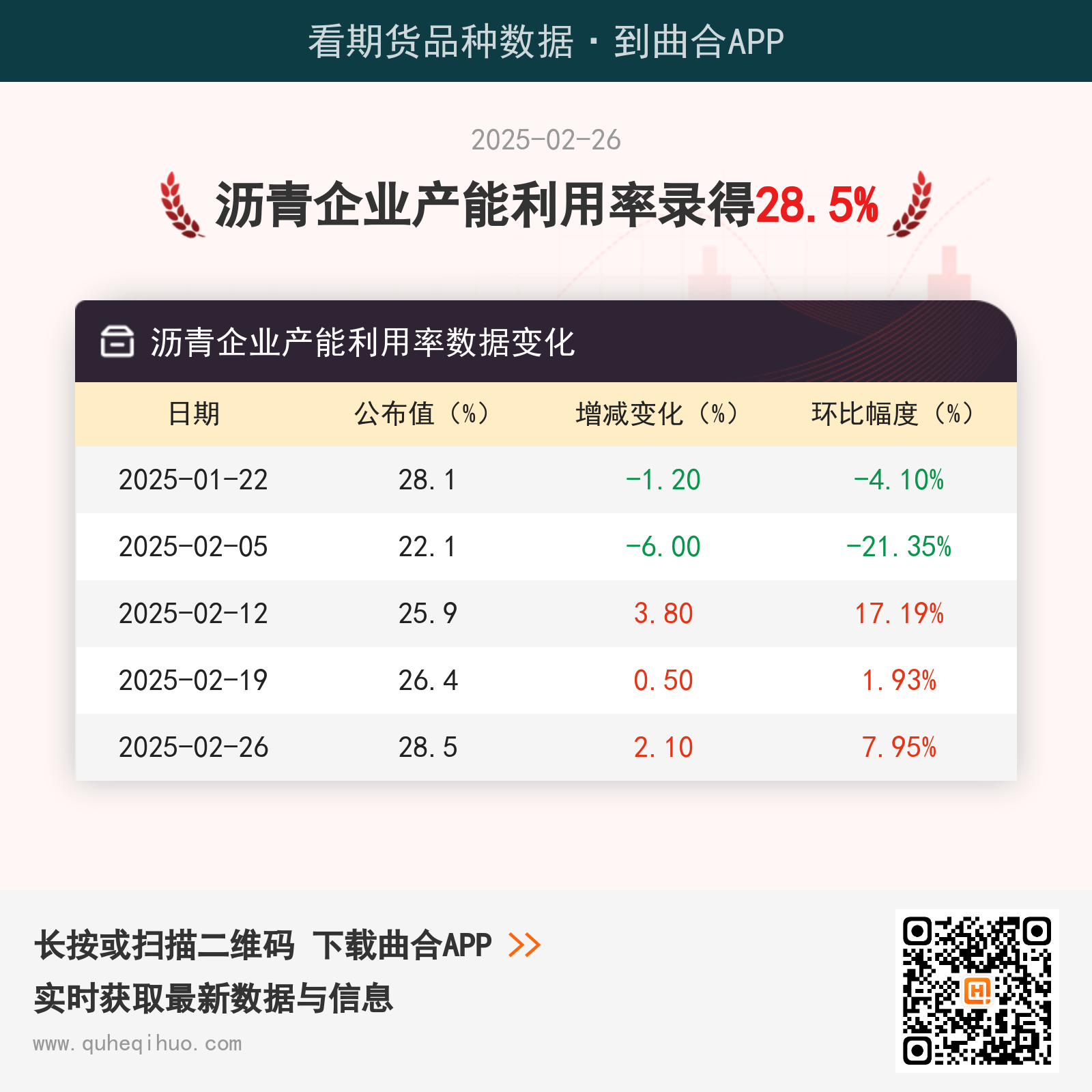 2月26日沥青企业产能利用率为28.5% 2025年02月26日 | 查看: 55557 截止2月26日,沥青企业产能利用率数据为 28.5%,较上一周增加2.1%,环比涨幅7.95%。 近期沥青企业产能利用率数据变化如下: 图片来源于网络,如有侵权,请联系删除 沥青期货实时行情 更新时间:---- 最新价 -- 涨跌值 -- 涨跌幅 -- 点击查看沥青最新行情走势 其它推荐 暂无相关文章 关键词: 上一篇:顺丁胶库存去化极其艰难 天然橡胶仓单问题属实 下一篇:2月26日建筑沥青产能利用率为24.8%