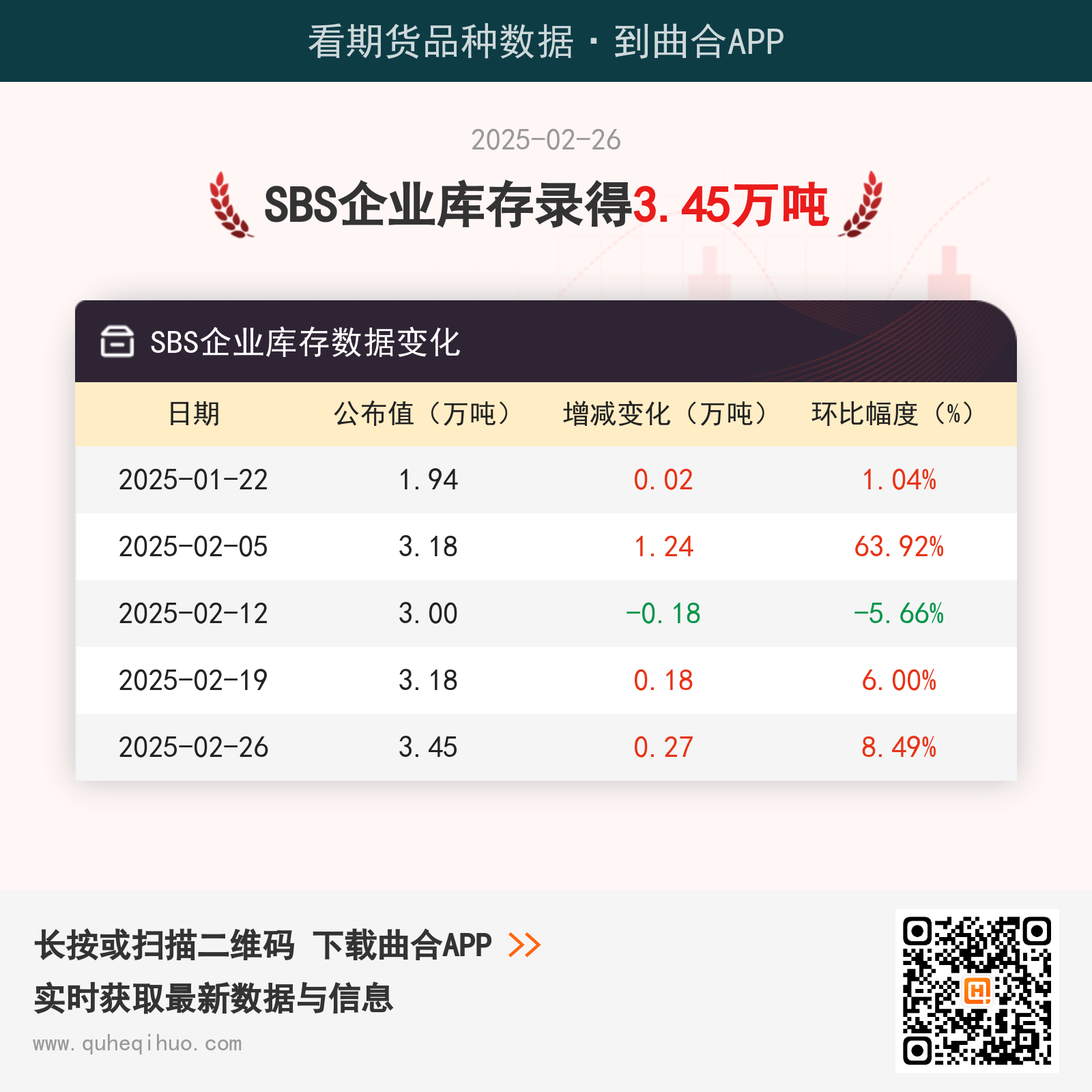 【库存】2月26日SBS企业库存3.45万吨 2025年02月26日 | 查看: 68716 截止2月26日,SBS企业库存数据为 3.45万吨,较上一周增加0.27万吨,环比涨幅8.49%。 近期SBS企业库存数据变化如下: 图片来源于网络,如有侵权,请联系删除 橡胶期货实时行情 更新时间:---- 最新价 -- 涨跌值 -- 涨跌幅 -- 点击查看橡胶最新行情走势 其它推荐 暂无相关文章 关键词: 上一篇:2月26日橡胶期货持仓龙虎榜分析:空方离场情绪强于多方 下一篇:2月26日塑料期货持仓龙虎榜分析:多空双方均呈离场态势
