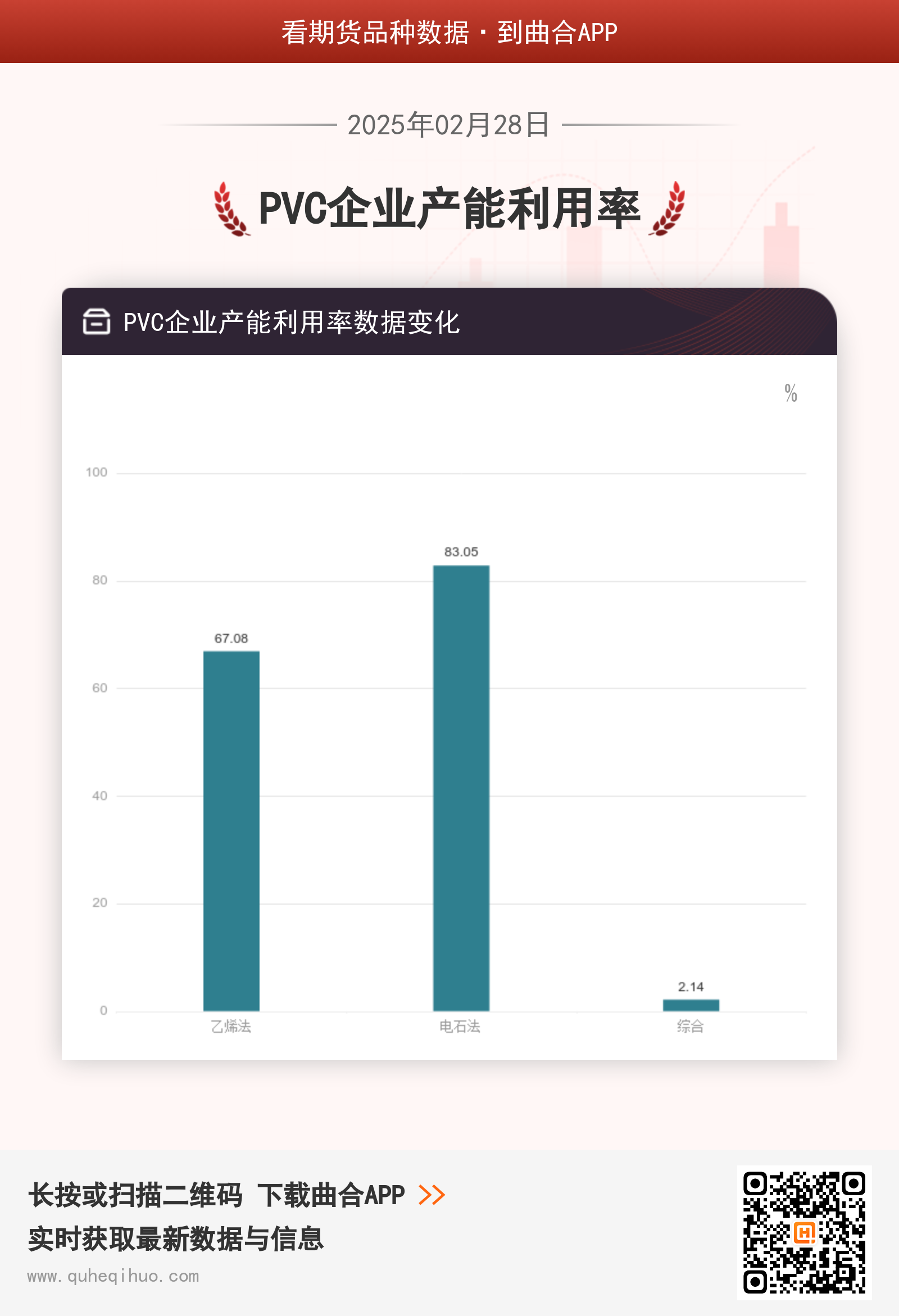 截止2月28日,乙烯法产能利用率为67.08%,较上一周减少5.34%,环比跌幅7.37%。电石法产能利用率为83.05%,较上一周减少0.82%,环比跌幅0.98%。综合产能利用率为2.14%,较上一周增加1.08%,环比涨幅101.89%。