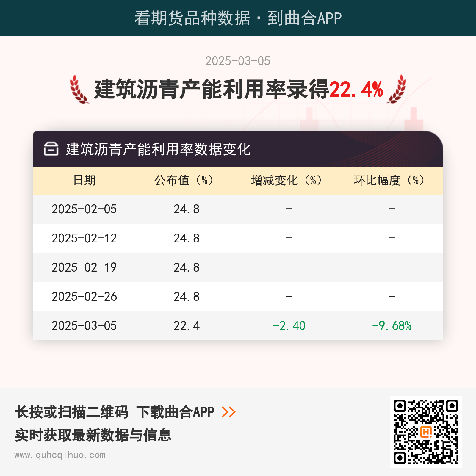 3月5日建筑沥青产能利用率为22.4% 2025年03月05日 | 查看: 56849 截止3月5日,建筑沥青产能利用率数据为 22.4%,较上一周减少2.4%,环比跌幅9.68%。 近期建筑沥青产能利用率数据变化如下: 图片来源于网络,如有侵权,请联系删除 沥青期货实时行情 更新时间:---- 最新价 -- 涨跌值 -- 涨跌幅 -- 点击查看沥青最新行情走势 其它推荐 暂无相关文章 关键词: 上一篇:3月5日沥青企业产能利用率为26.5% 下一篇:2025年3月5日今日现货乙二醇最新价格多少钱一吨