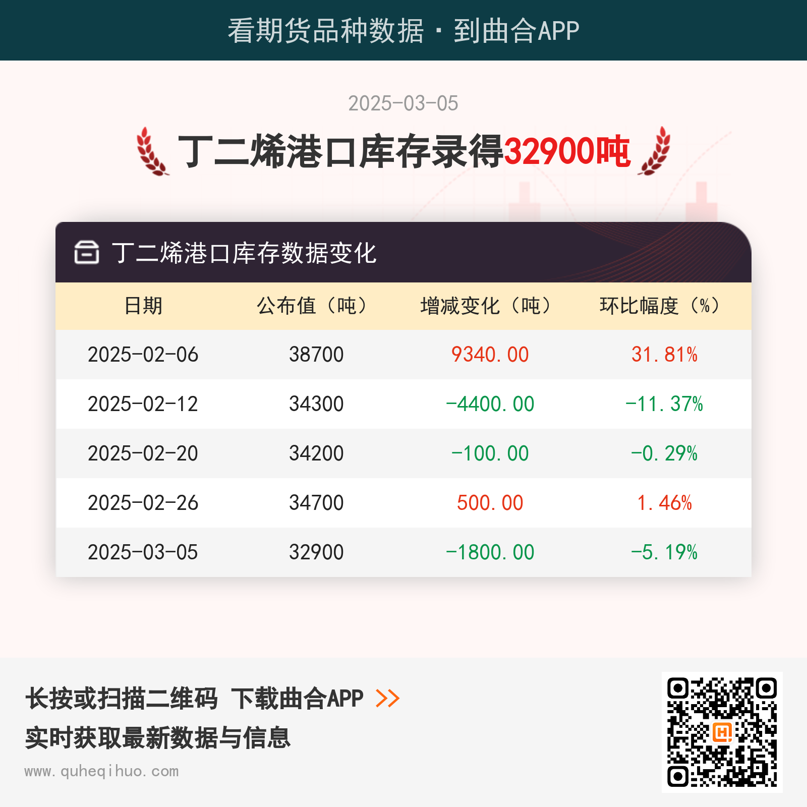 【库存】3月5日丁二烯港口库存32900吨 2025年03月05日 | 查看: 49783 截止3月5日,丁二烯港口库存数据为 32900吨,较上一周减少1800吨,环比跌幅5.19%。图片来源于网络,如有侵权,请联系删除 近期丁二烯港口库存数据变化如下: 橡胶期货实时行情 更新时间:---- 最新价 -- 涨跌值 -- 涨跌幅 -- 点击查看橡胶最新行情走势 其它推荐 暂无相关文章 关键词: 上一篇:【库存】3月5日SBS企业库存3.31万吨 下一篇:(2025年3月6日)今日纯碱期货最新价格行情查询