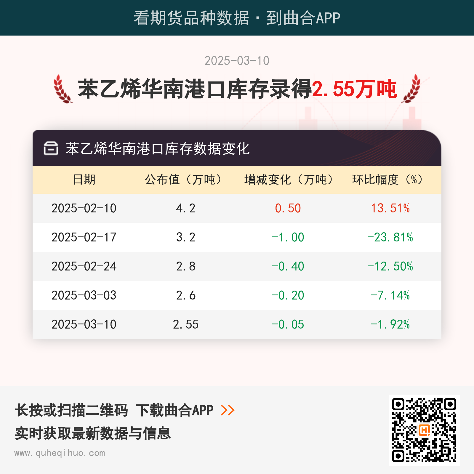 截止3月10日,苯乙烯华南港口库存数据录得 2.55万吨,较上一周减少0.05万吨,环比跌幅1.92%。