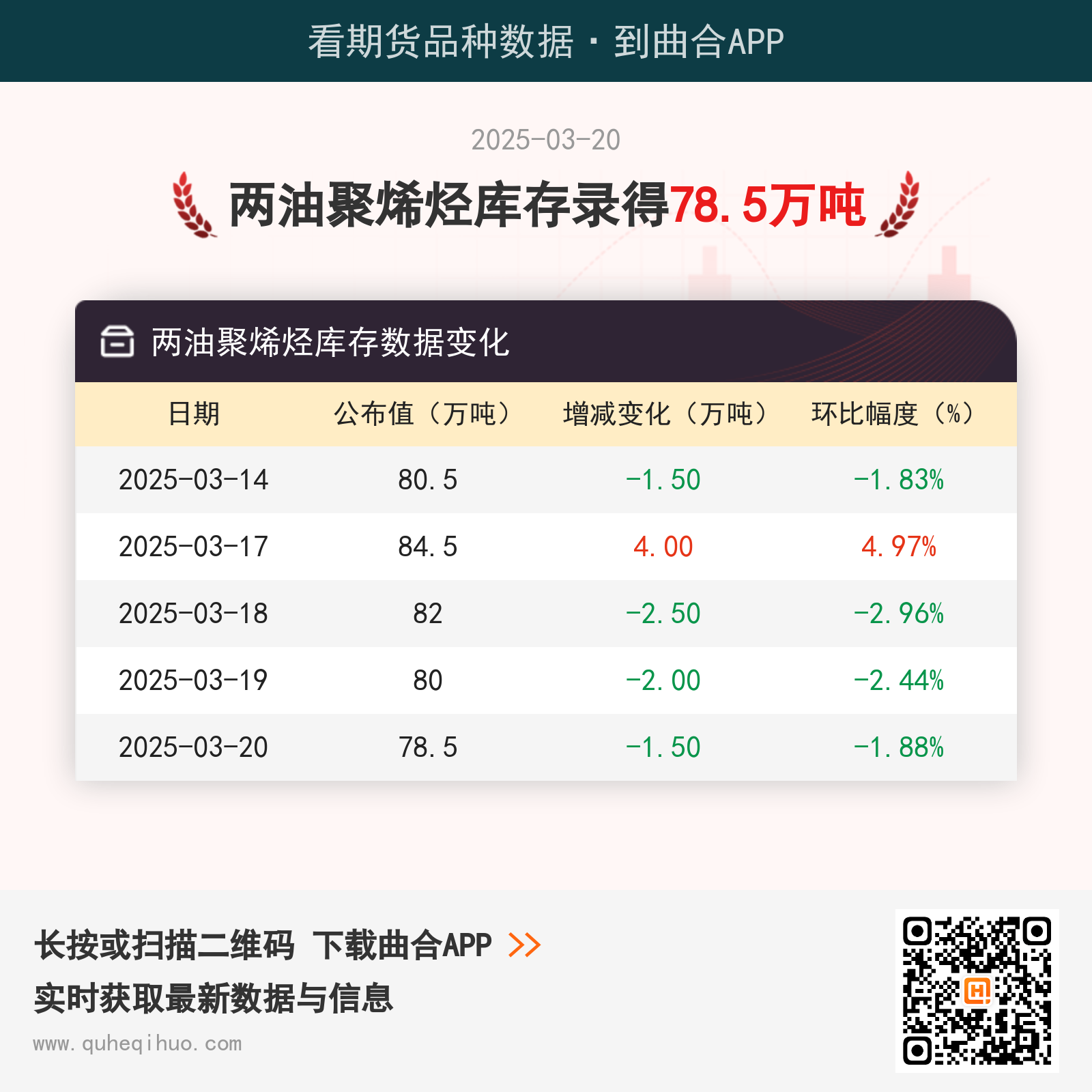 3月20日两油聚烯烃库存为78.5万吨 2025年03月20日 | 查看: 60309 3月20日,两油聚烯烃库存为 78.5万吨,较上一周减少1.5万吨,环比跌幅1.88%。 近期两油聚烯烃库存数据变化如下: 图片来源于网络,如有侵权,请联系删除 聚乙烯期货实时行情 更新时间:---- 最新价 -- 涨跌值 -- 涨跌幅 -- 点击查看聚乙烯最新行情走势 其它推荐 暂无相关文章 关键词: 上一篇:(2025年3月20日)今日天然橡胶期货最新价格行情查询 下一篇:烧碱期货市场仓单压力大幅缓解 期价跌幅超1%