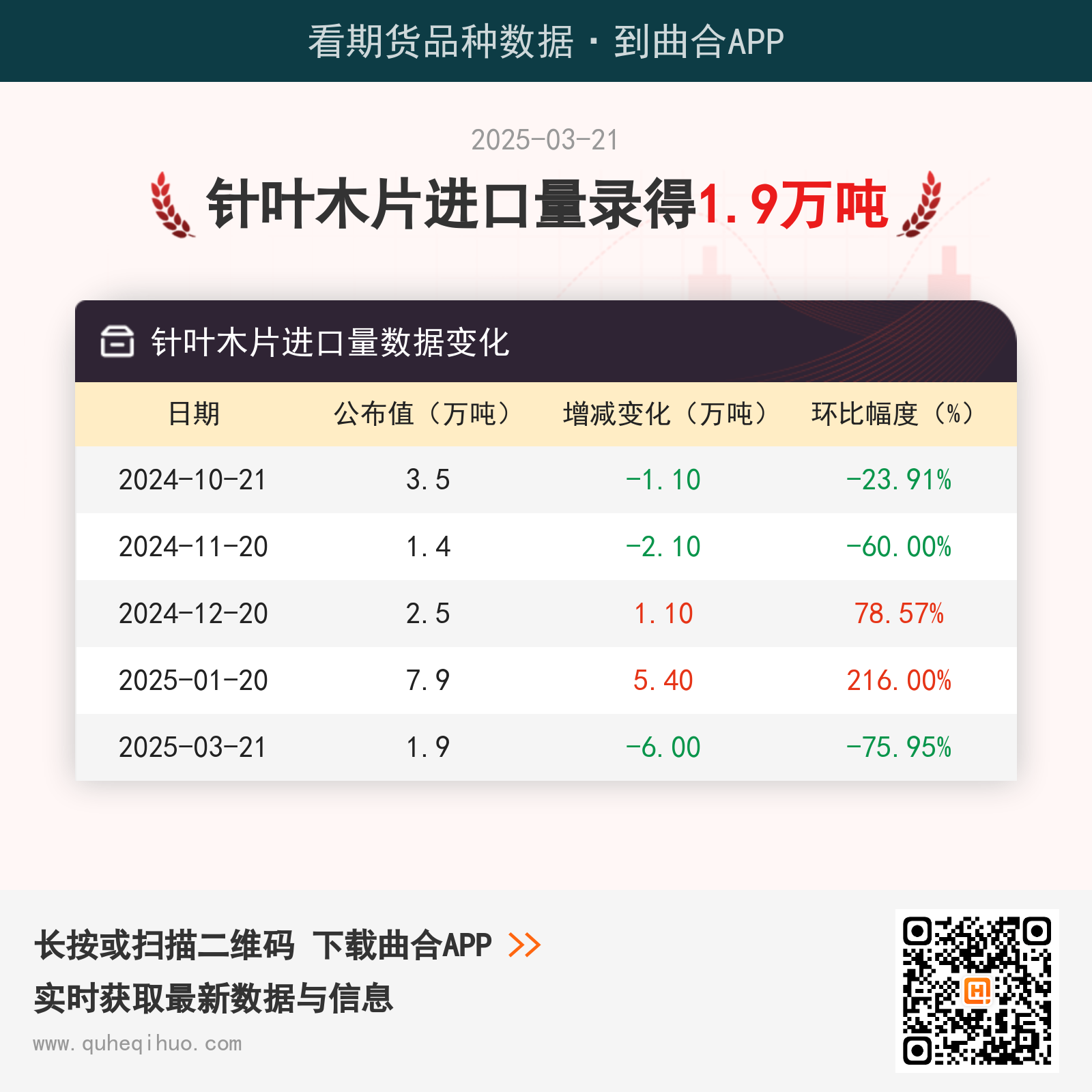截止3月21日,针叶木片进口量数据录得 1.9万吨,较上一月减少6.0万吨,环比跌幅75.95%。